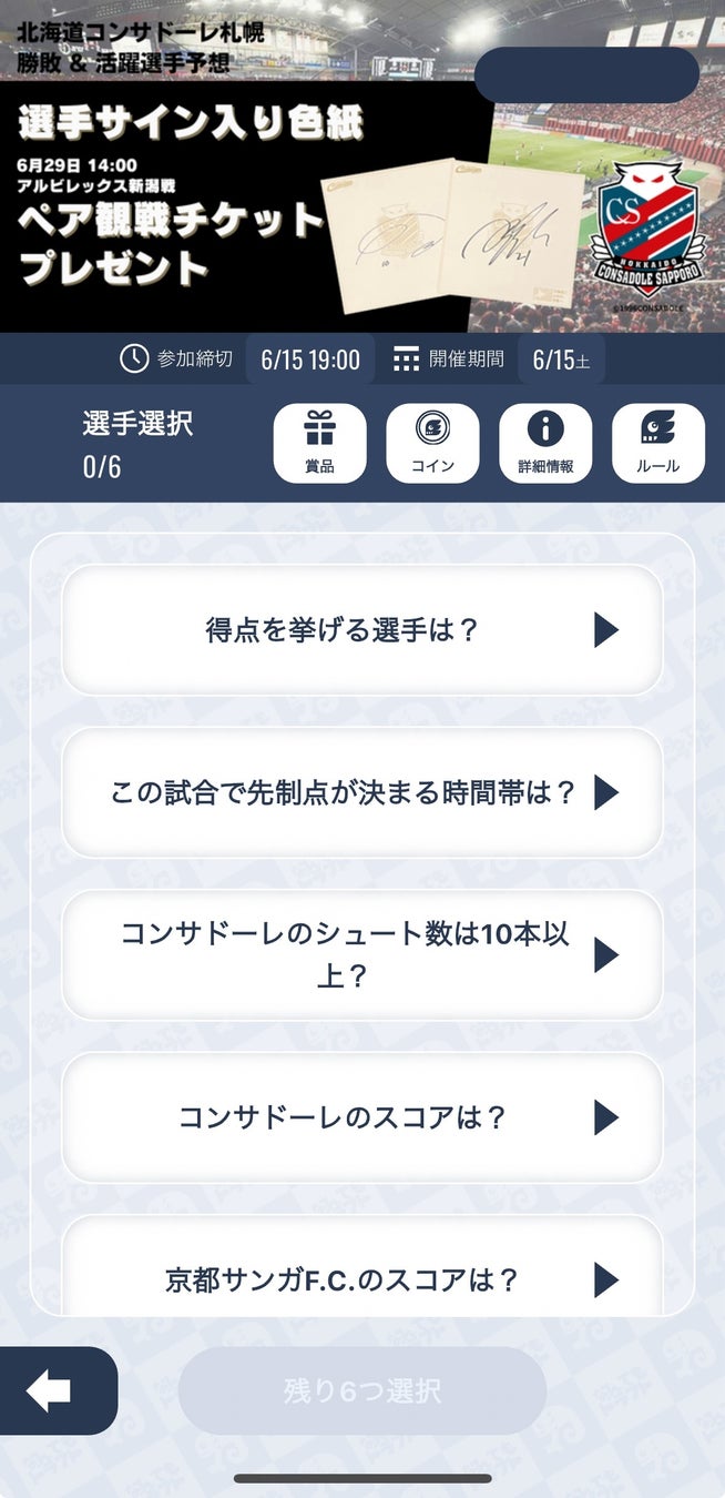 今週末のアウェイ・京都戦の試合展開・活躍選手を予想し、予想成績1位と2位になった方2名様には、6月29日(土)に札幌ドームで行われる北海道コンサドーレ札幌のホームゲーム新潟戦の観戦ペアチケットと選手サイン色紙をセットで、3位〜5位の方3名様には選手サイン色紙をプレゼントします。