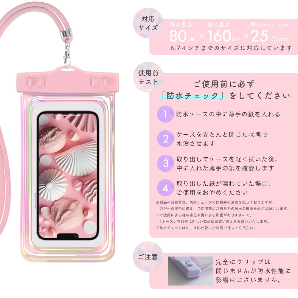 本製品は、デザイン性の高いスマートフォン用防水ケースです。スマートフォンを防水ケースに入れたままでもクリアな写真撮影が可能です。国際防水規格「IP68」を取得し、「継続的に水没しても内部に浸水することが無い(水中形)」という基準を満たす、心強い防水ケースです。フェスやキャンプ、プールでのレジャー使用や、雨の日やバスタイムでの普段使い、さまざまなシチュエーションでお使いいただけます。