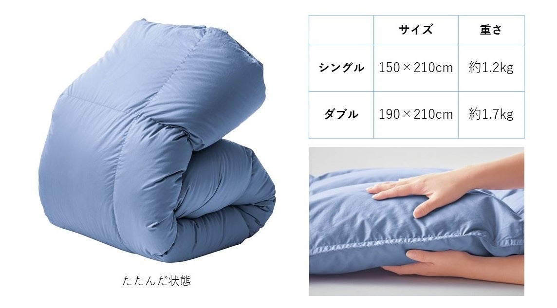 生地が軽くなったことで羽毛がつぶれにくく、たっぷり空気を含むので優れた保温性を発揮します。