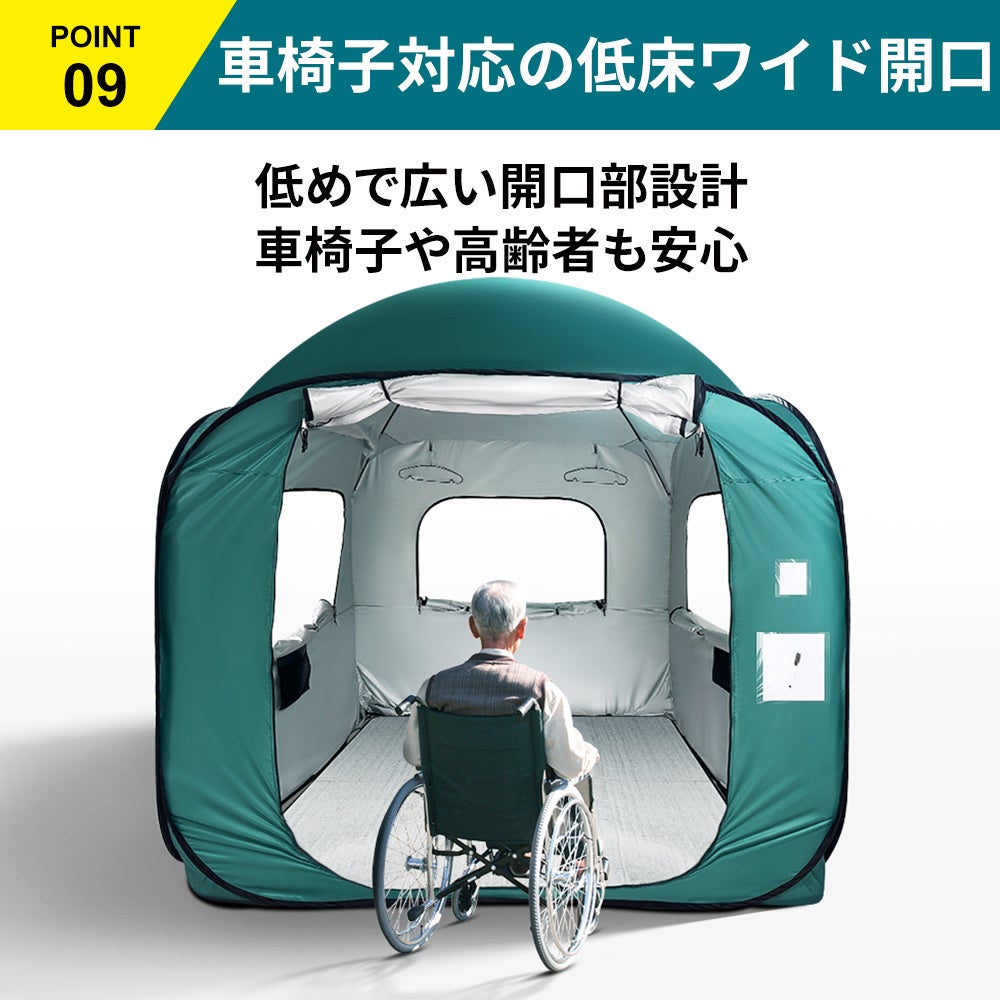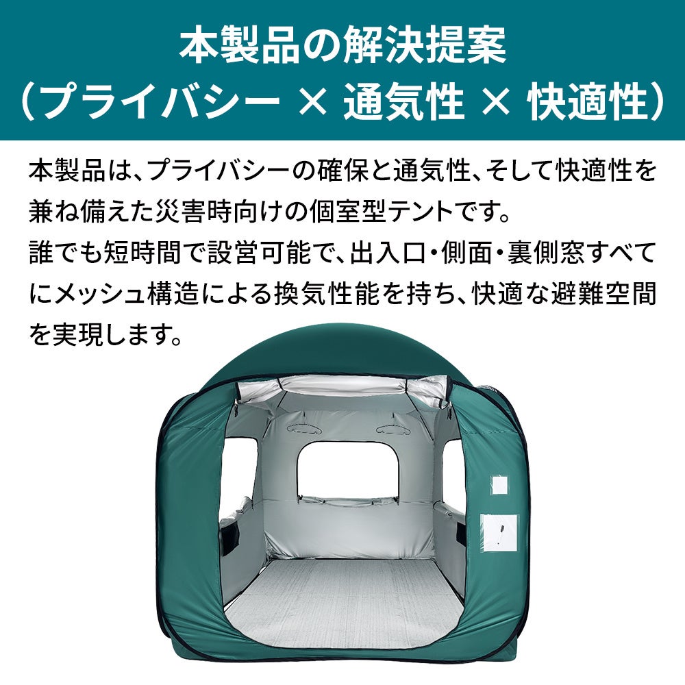 大規模災害時には、多くの被災された方々が体育館などで集合して避難生活を送るため、プライバシーの確保が難しく、更衣や授乳、トイレなど、生活する上での不自由さが多数報告されています。このテントを設置することでそうした不自由さを解消し、避難生活でのストレスを大幅に軽減できます。