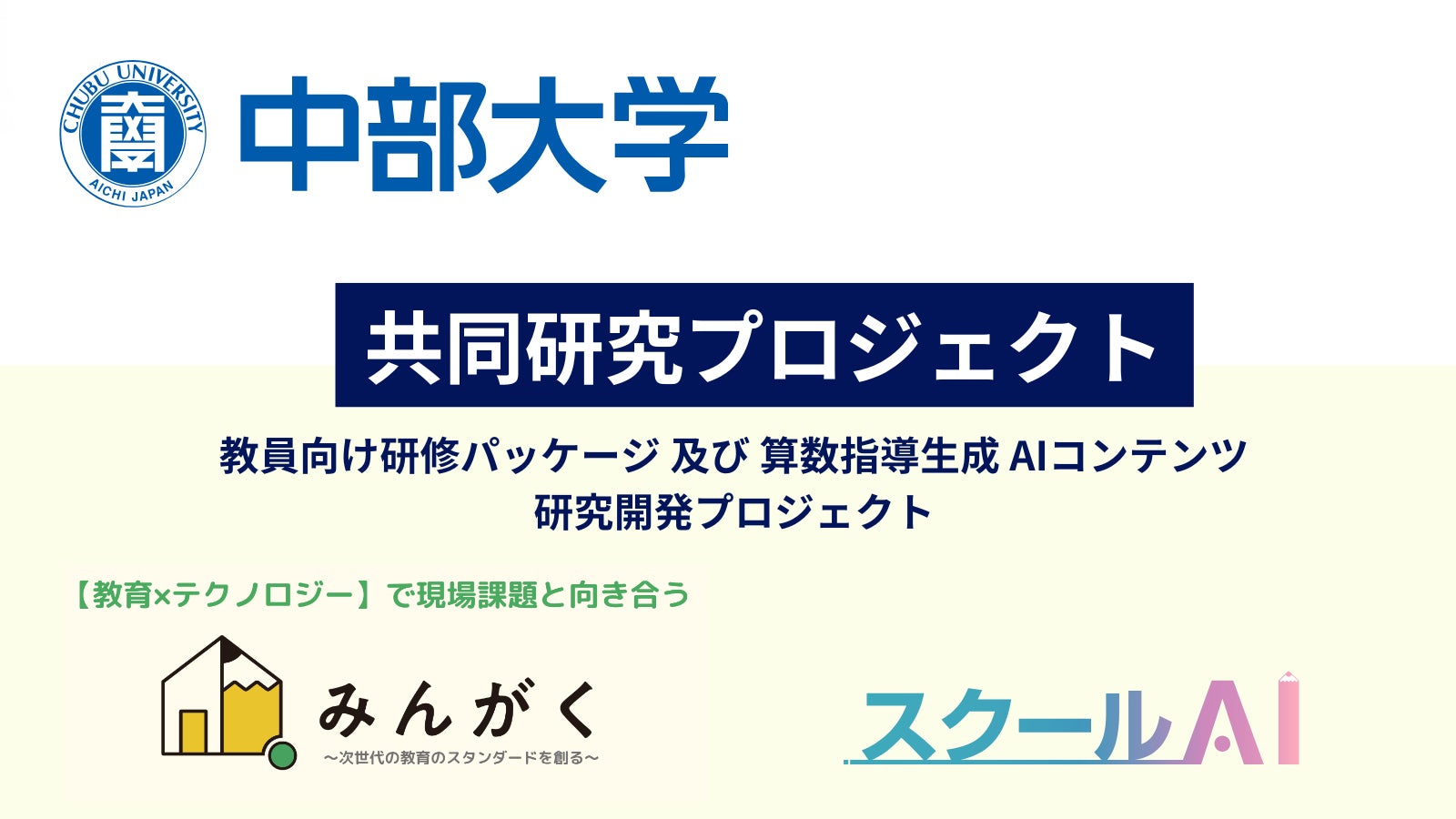 教育×生成AIをテーマに、教育サービス開発を⼿掛ける株式会社みんがく(東京都⽬⿊区、代表取締役:佐藤雄太)は、学校法人中部大学(愛知県春日井市、学長:竹内芳美)と共同で、算数における生成AI活用に関する研究を開始することを発表します。