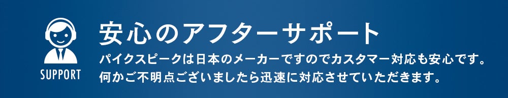 PYKES PEAKは日本のメーカーです。カスタマーサポートも日本人スタッフが日本語で丁寧に対応いたします。初期不良や故障などの場合は、お気軽にご連絡ください。製品保証を含めて対応させていただきます。