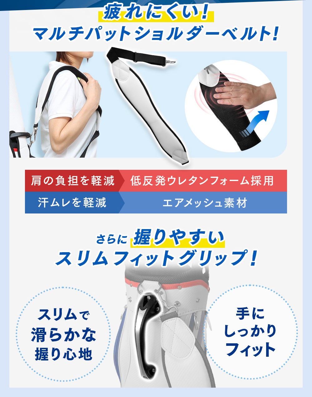 Multi-pad Shoulder Beltは、低反発ウレタンフォームを採用しており、持ち運び時の肩への負担を軽減します。さらに、ベルト内側にエアメッシュ素材を使用することで、キャディバッグを持ち運ぶ際の汗の蒸れを軽減します。また、スリムで滑らかな握り心地のSlim Fit Gripは手にしっかりとフィットし、安定した握りを提供し、手や指への負担を軽減します。