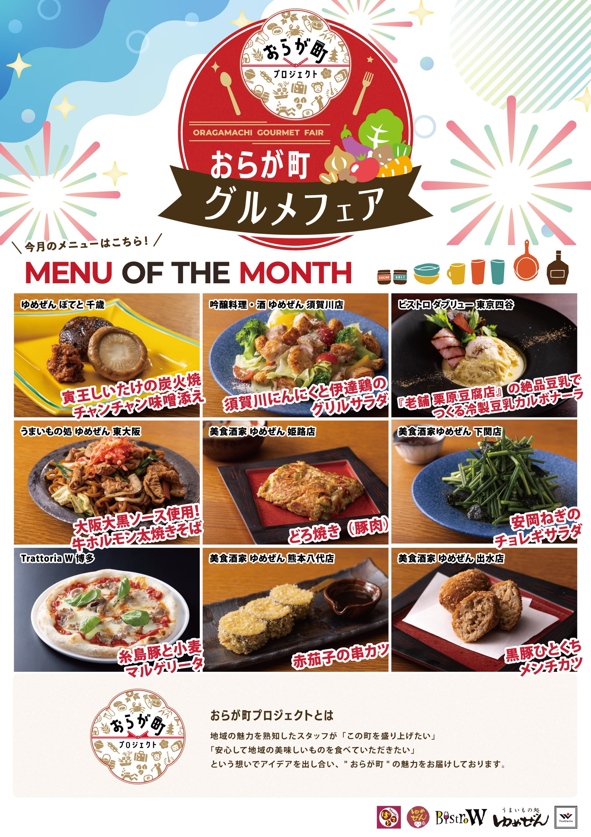 このプロジェクトの一環として、食で地域の魅力を発信することを目的に「おらが町グルメフェア」を実施します。全国各地にある直営レストラン・居酒屋9店舗の料理長が工夫を凝らし、季節ごとに新しいメニューが登場します。地域の旬食材をいつもとは違う食べ方で、美味しくアレンジしたメニューでご提供しますので、近隣にお住まいの方も、出張や旅行でホテルにお泊りの方もお楽しみいただけます。