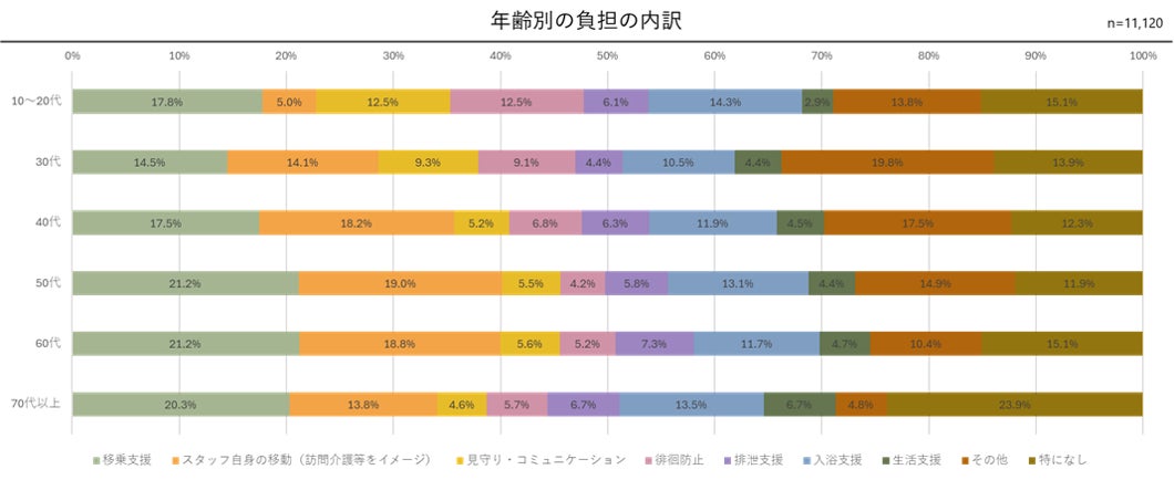 ●「移乗支援」を最も大きな負担と感じる比率は、50~70代で上昇。
