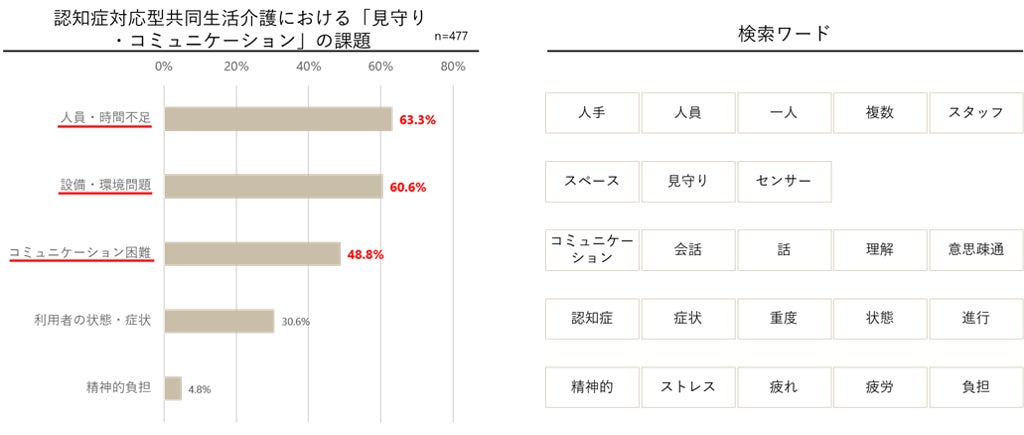 認知症対応型共同生活介護サービスに従事する職員の中で、「見守り・コミュニケーション」を課題としてあげた477人の回答を分析しました。
