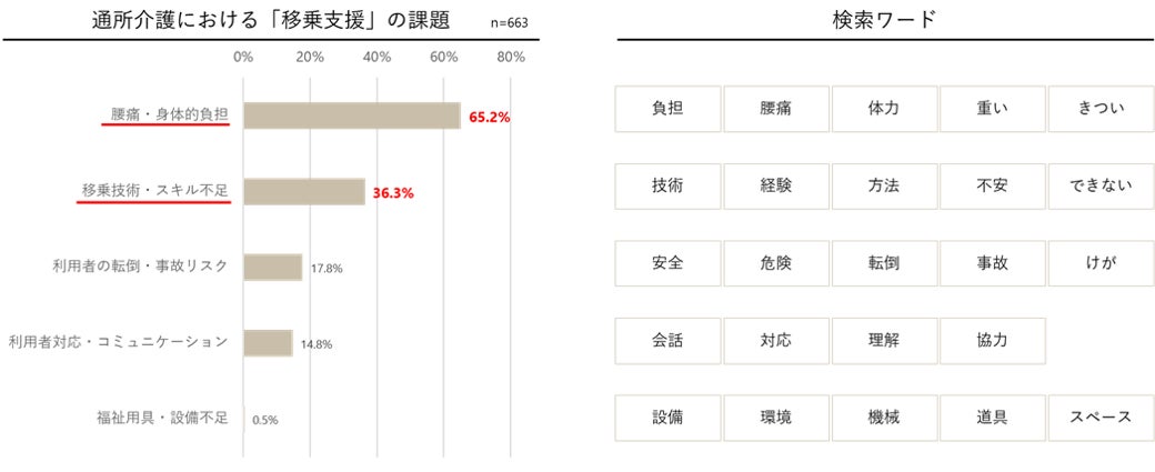通所介護サービスに従事する職員の中で、「移乗支援」を課題としてあげた663人の回答を分析しました。