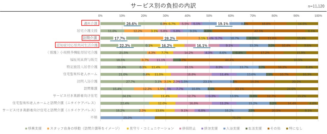 施設に利用者様を迎えてサービスを行う通所介護では、「移乗支援」が最も多く(28.6%)、次いで「入浴支援」(19.1%)となりました。訪問介護では、「スタッフ自身の移動」が最も多くなり(28.2%)、「移乗支援」(17.7%)を10.5ポイント上回りました。認知症の利用者様の共同生活を支援する認知症対応型共同生活介護では、通所介護と同様に「移乗支援」が22.3%で最も多いものの、「見守り・コミュニケーション」(16.2%)、「徘徊防止」(16.1%)も高い比率となりました。
