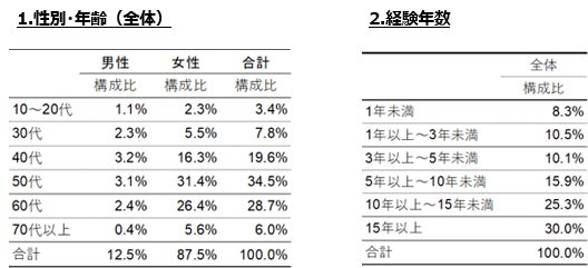 女性は、1位「移乗支援」、2位「スタッフ自身の移動」、3位「入浴支援」となりましたが、1位と2位は拮抗した比率となっています。下記の回答者属性の通り、ニチイグループでは訪問介護を行う女性職員が非常に多いため、訪問介護に紐づく「スタッフ自身の移動」が男性の4.8%を大きく上回る結果となっていると推測されます。