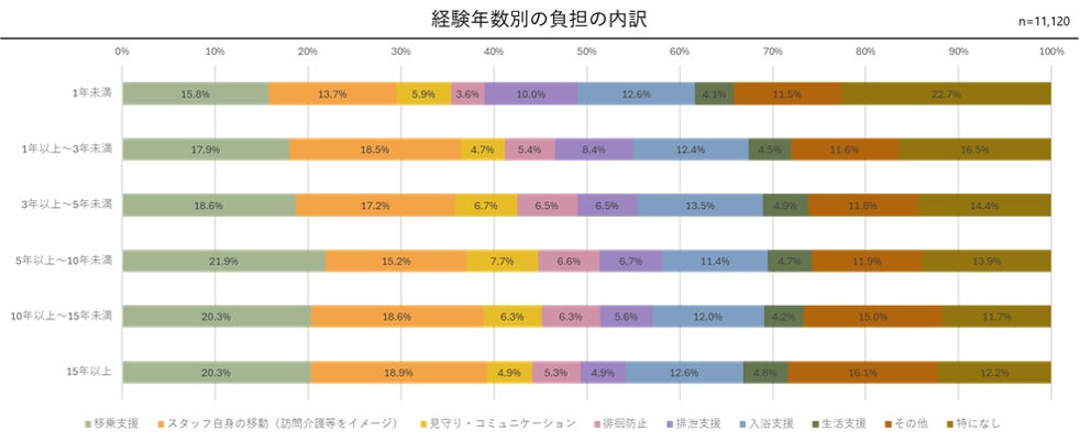 ほぼ全ての経験年数で1位「移乗支援」、2位「スタッフ自身の移動」、3位「入浴支援」となりました。1年以上3年未満のみ、「スタッフ自身の移動」が「移乗支援」を上回っていますが、その差はわずか0.6ポイントです。