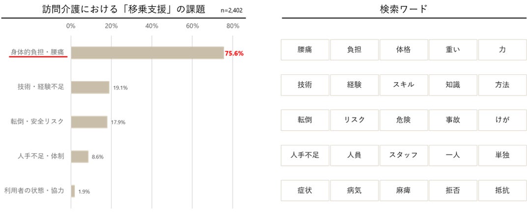 訪問介護サービスに従事する職員の中で、「移乗支援」を課題としてあげた2,402人の回答を分析しました。