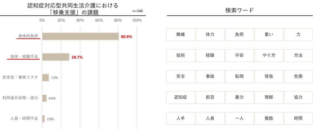 認知症対応型共同生活介護サービスに従事する職員の中で、「移乗支援」を課題としてあげた540人の回答を分析しました。