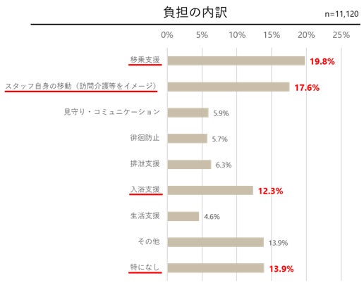 次いで、利用者様の居宅を訪ねてサービスを行う訪問介護の「スタッフ自身の移動」が約18%、入浴の介助を行う「入浴支援」が約12%となりました。