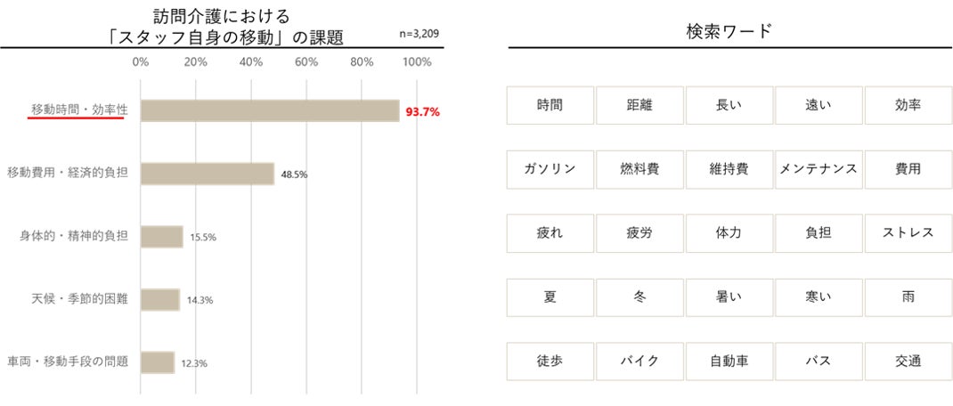 訪問介護サービスに従事する職員の中で、「スタッフ自身の移動」を課題としてあげた3,209人の回答を分析しました。