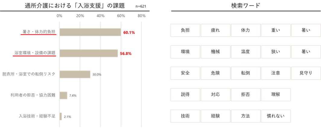 「入浴支援」の負担は、体力面以外に、広さや暑さなどの環境によるものが大きいことがわかりました。