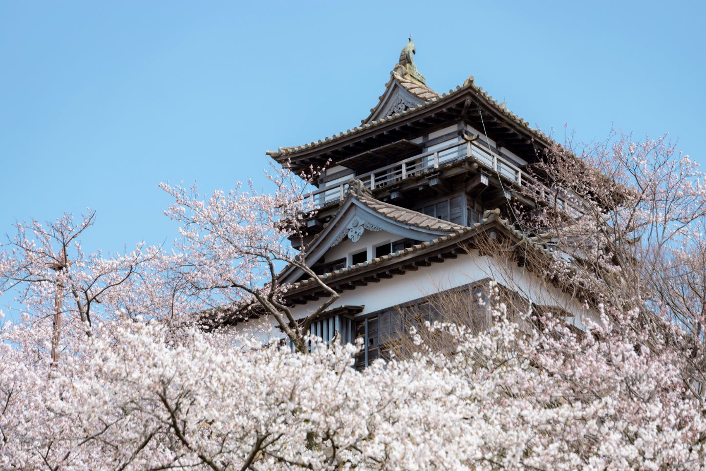 丸岡城は別名霞ヶ城とも呼ばれ、平野の独立丘陵を利用してつくられた平山城です。戦国時代の天正4年(1576年)一向一揆の備えとして、織田信長の命を受けて柴田勝家の甥・勝豊が築きました。丸岡城天守は、江戸時代以前に建てられ当時の姿で現在まで残っている現存12天守の1つです。昭和23年の福井地震により石垣もろとも完全に倒壊しましたが、天守の材料や石垣などの主要部材の多くを再利用して昭和30年に修復修理されました。現在立ち続けている古式の風格のある姿は、消滅の危機という困難な道のりを経ても立ち上がり復興してきた証であり、その歴史は他にはない波乱の運命を歩んだものです。