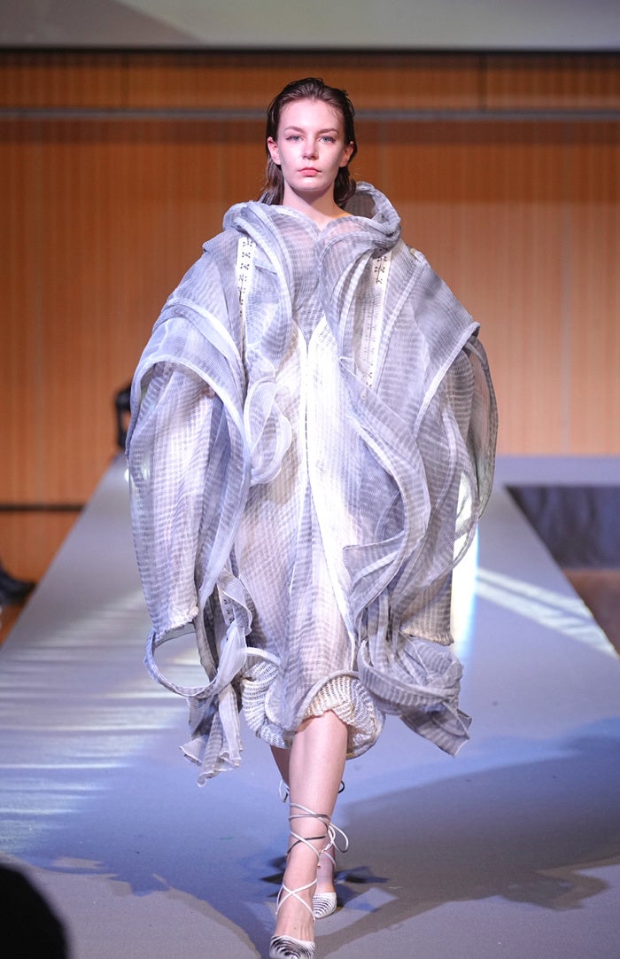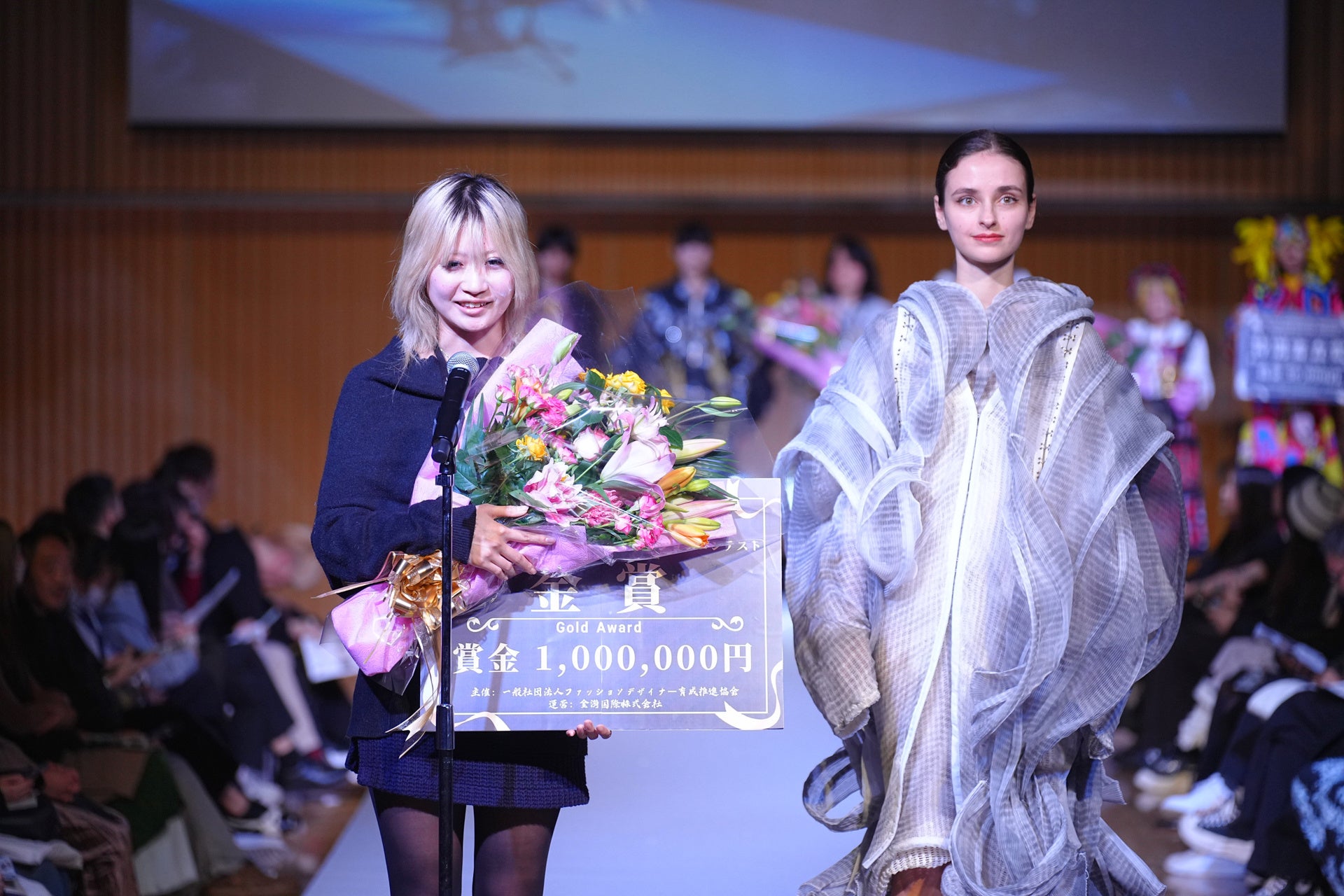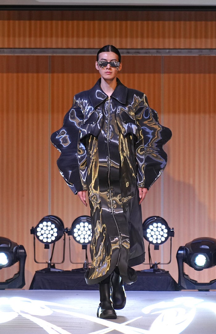 「リハーサルを見て自信をなくしていたため、準グランプリと発表された瞬間は全く実感が湧きませんでした。今回のテーマ『DISTORTION(歪み)』は、年齢を重ねるにつれて人の姿勢が歪んでいくことからインスピレーションを得ています。制作ではいかにシルエットを美しく見せるかにこだわりました。ステンレスのような無機質で光沢感のある素材を用い、テーマである『歪み』を流動的なフォルムに落とし込みました。審査員の方々からシルエットの新しさや形の美しさについて評価をいただけたことが何よりも嬉しかったです。」