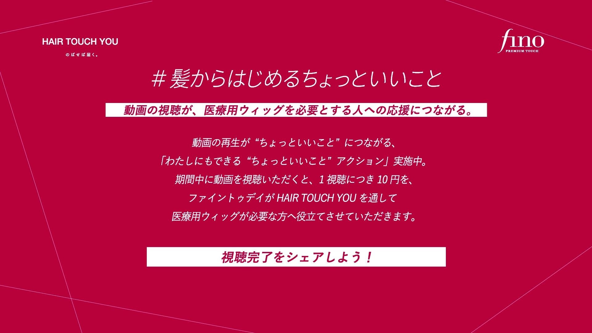 また、動画の視聴をすることで“ちょっといいこと”につながる、「わたしにもできる“ちょっといいこと”アクション」も実施いたします。期間中に対象動画を視聴いただくと10円が寄付されるもので、フィーノ医療用ウィッグプログラム【HAIR TOUCH YOUのばせば届く。】を通して、医療用ウィッグが必要な方へ役立てさせていただきます。