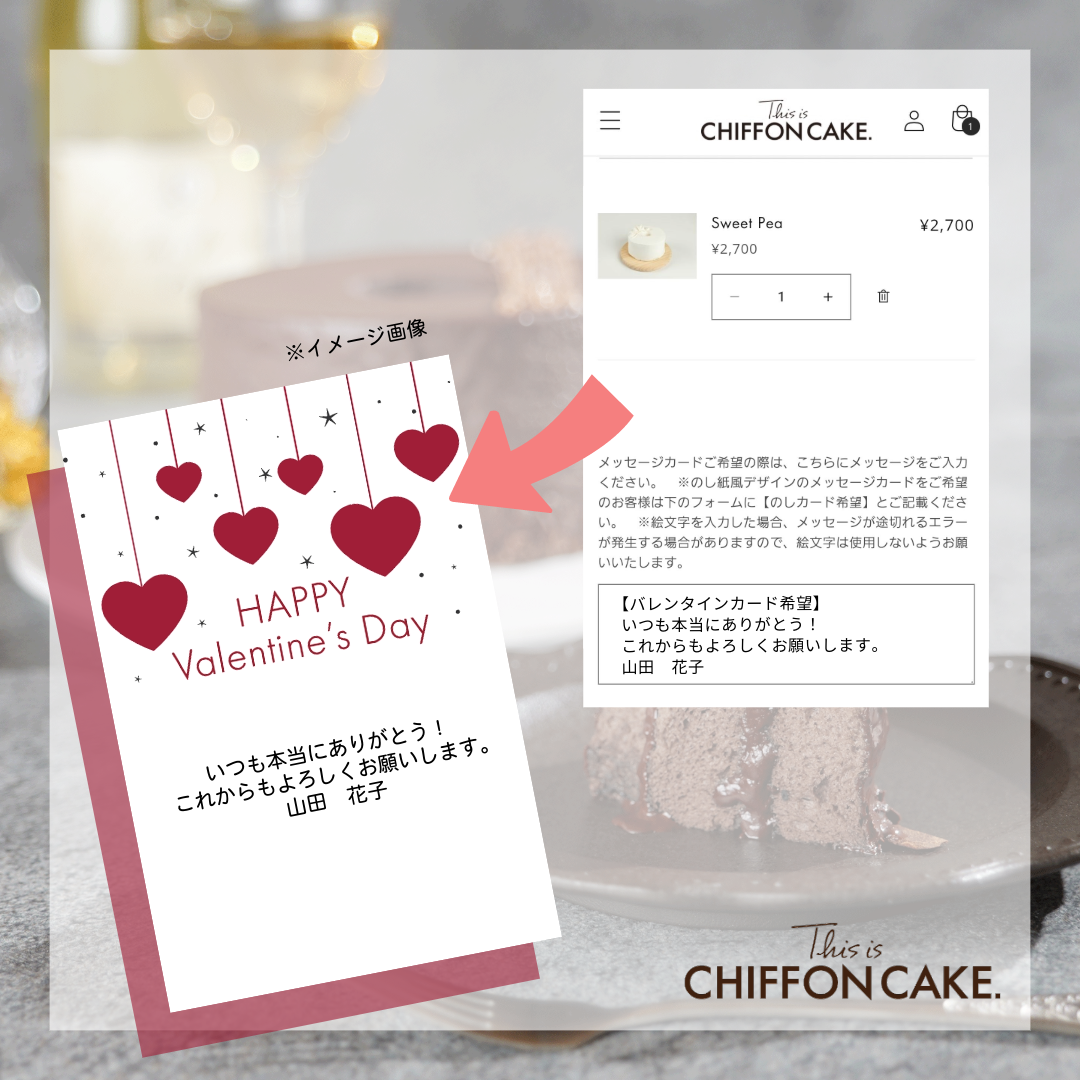 This is CHIFFON CAKE.では通常デザインのメッセージカードに加え、バレンタインデザインのメッセージカードをご用意しています。