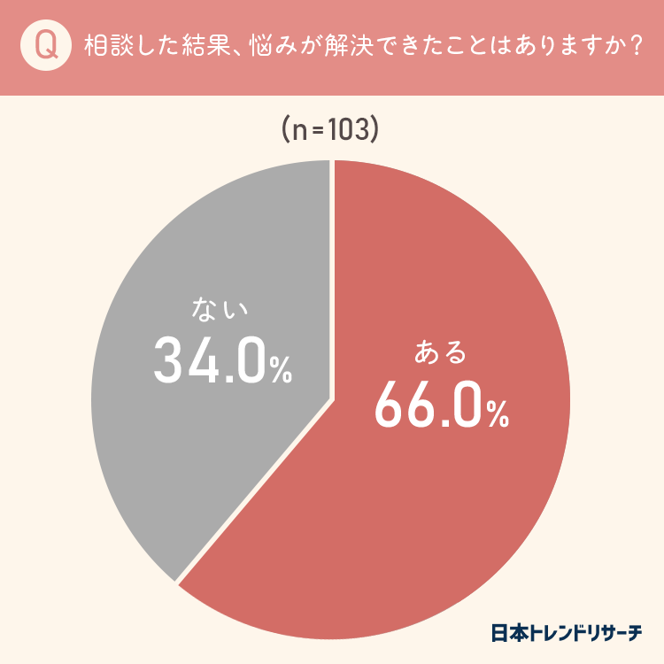 66%の方が「相談した結果、悩みが解決できたことがある」と回答しました。