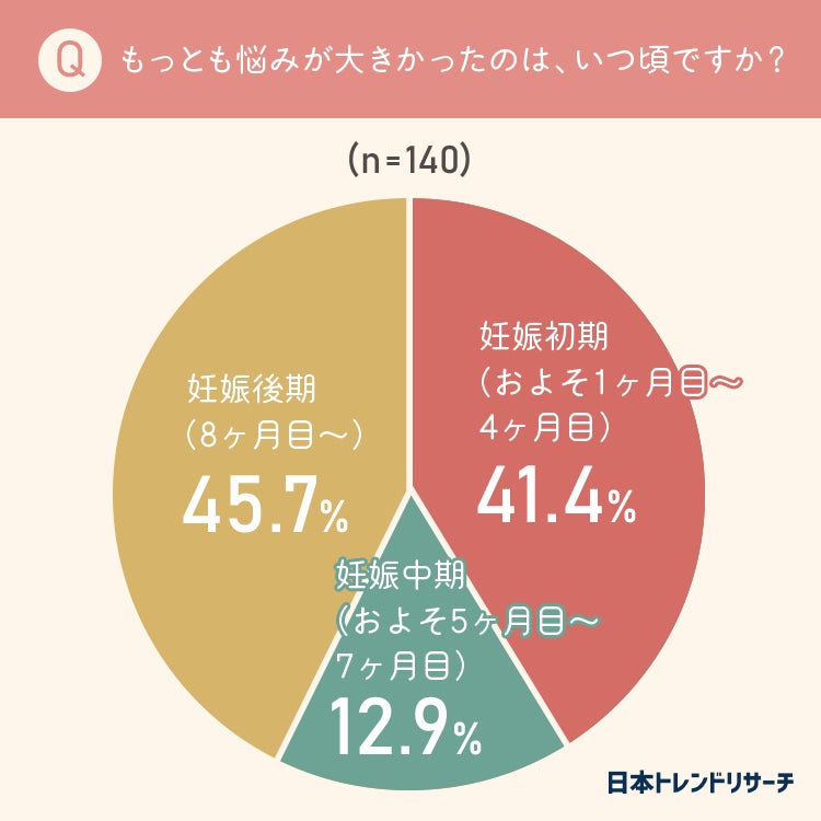 45.7%の方が「妊娠後期」、41.4%の方が「妊娠初期」と回答し、妊娠直後や出産前に悩む方が多いようです。