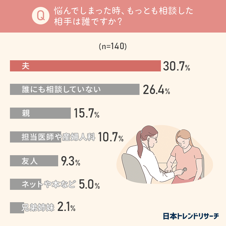 「夫」と回答した方が30.7%ともっとも多かった一方で、「誰にも相談していない」という方も26.4%いました。