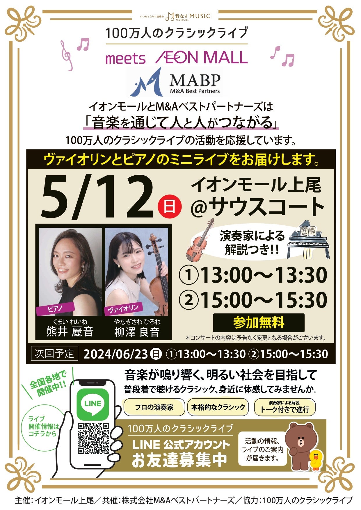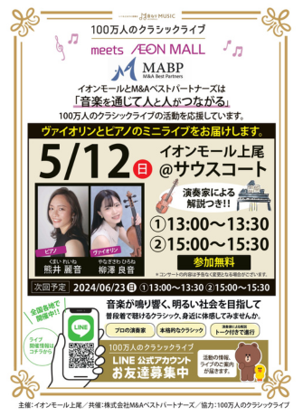 【M&Aベストパートナーズ×100万人のクラシックライブ】5月12日(日)にイオンモール上尾にて、クラシックライブを開催!