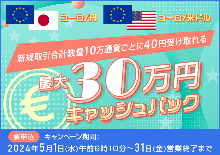 キャンペーンに申し込まれたお客さまに、期間中におけるユーロ/円とユーロ/米ドルの新規取引合計数量に応じて、最大300,000円をキャッシュバックします。