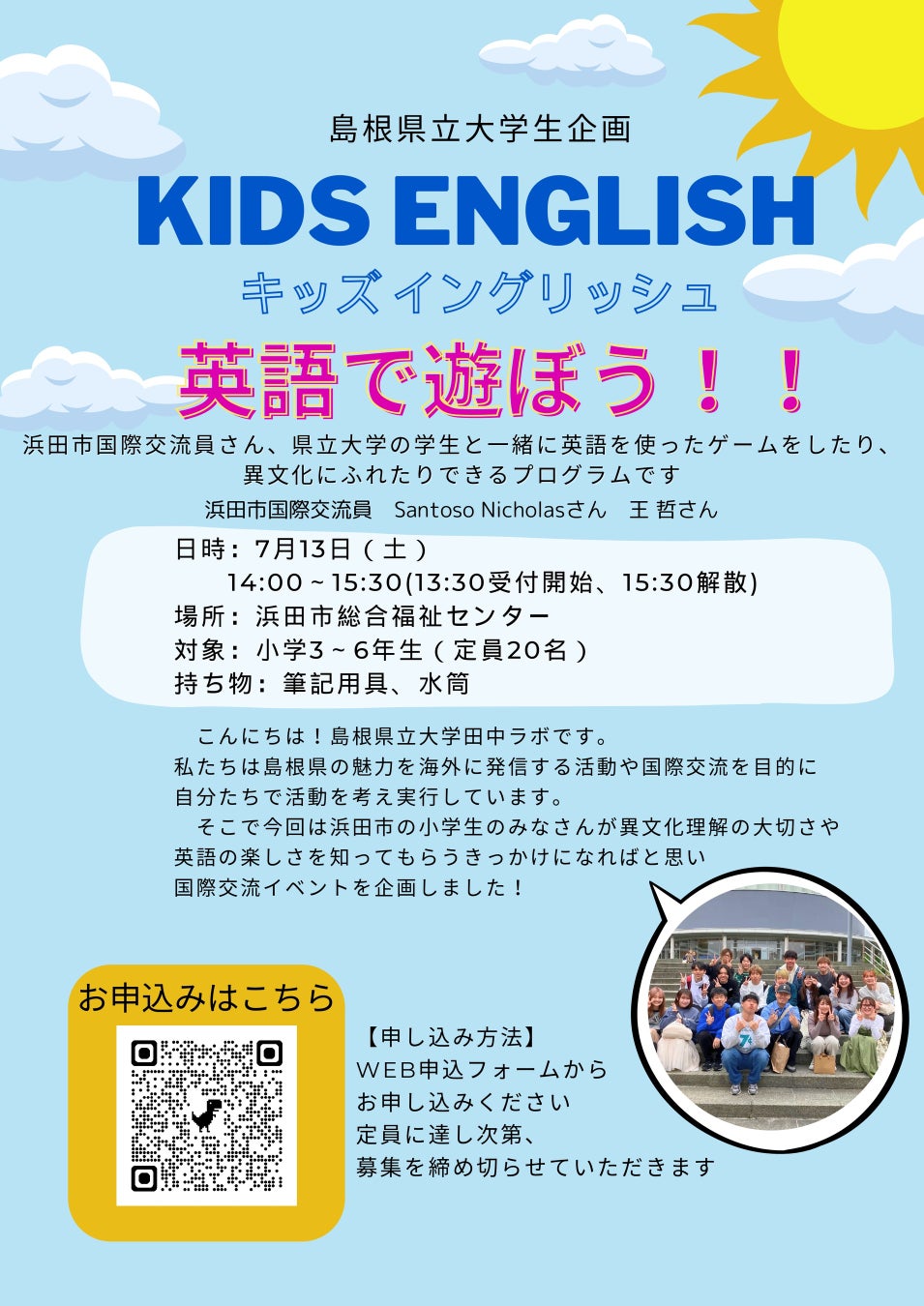 「KIDS ENGLISH 英語で遊ぼう!!」浜田市の小学生と異文化交流会を7月13日(土)に開催します!【島根県立大学】