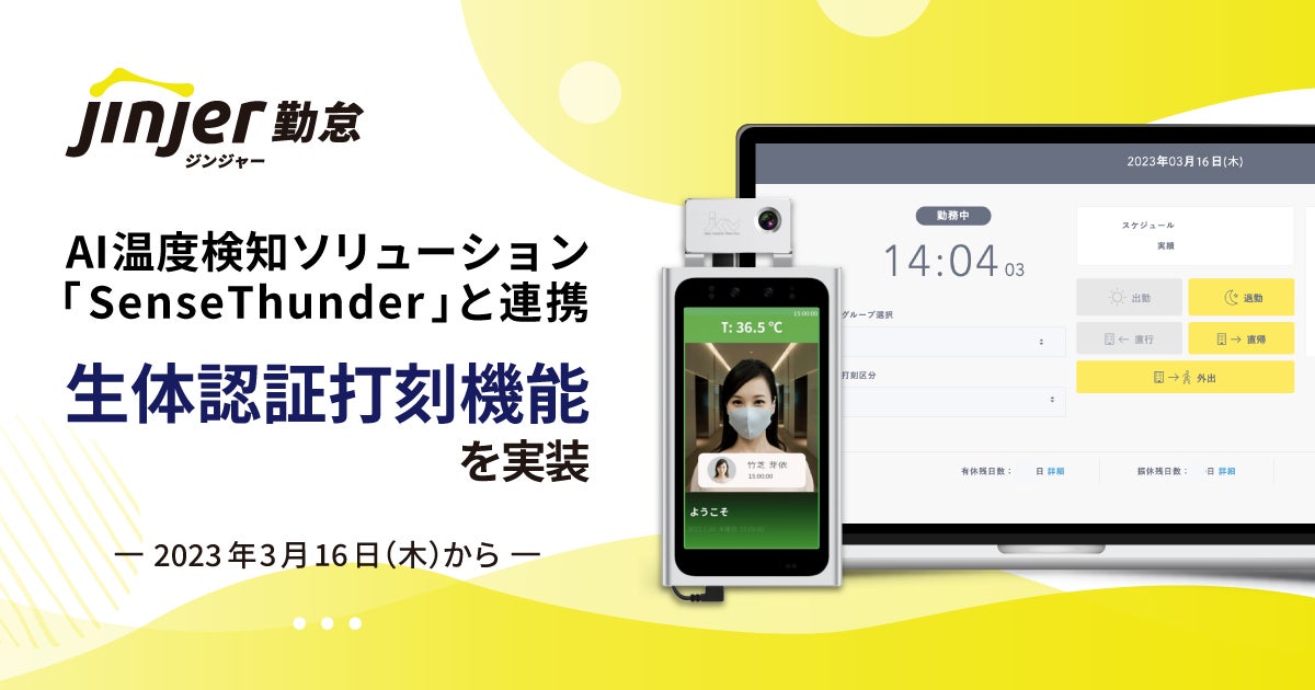 勤怠管理サービス「ジンジャー勤怠」へAI温度検知ソリューション「SenseThunder」と連携した生体認証打刻機能を実装