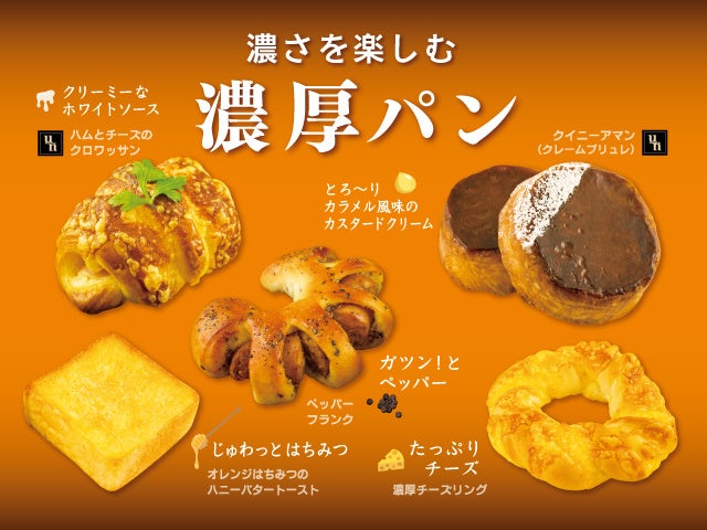 はちみつバターや、ダイスチーズ、ブラックペッパーなどを使用した、あま~いパンからボリュームたっぷりの総菜パンまで濃厚なパンをご用意いたしました!
