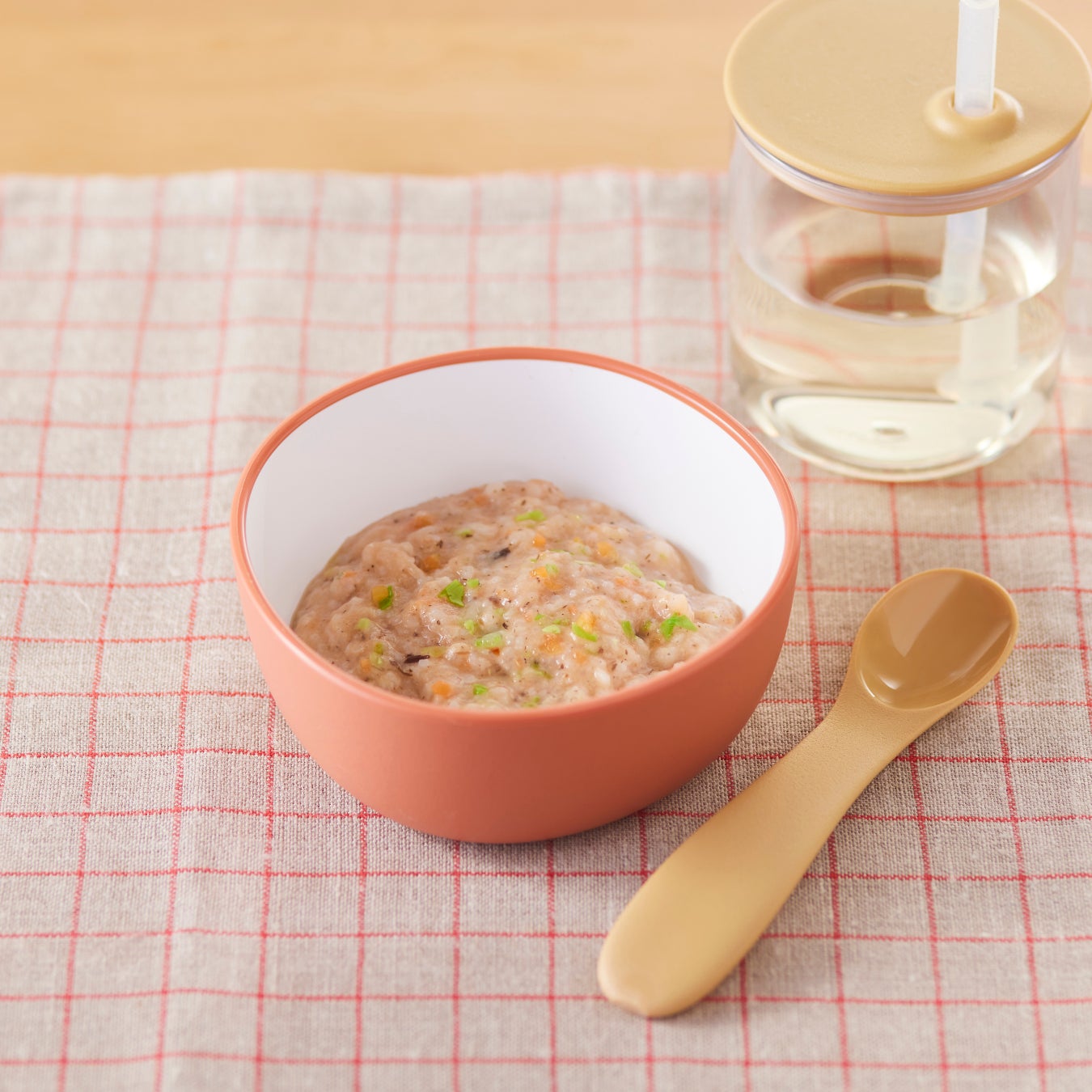 離乳食に必要な、炭水化物・タンパク質・ビタミン&ミネラルを一度に摂れる栄養満点の一皿。離乳食中期にちょうどいい、なめらかな食感のおかゆがつくれます。