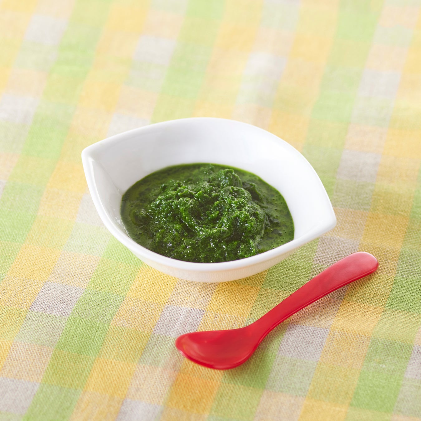 やさしい甘さのりんごと鉄分豊富な小松菜を組み合わせた、離乳食初期におすすめのペースト。温かいうちに撹拌することで、舌触りが滑らかな食感に。