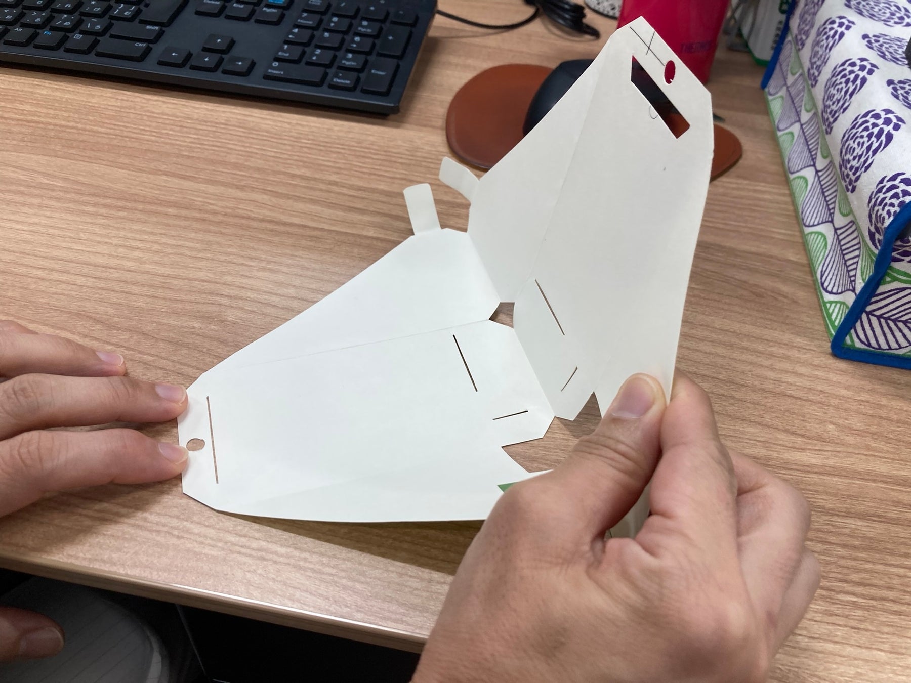 1枚の紙を折りたたみ、組み立てる。何度も何度も試作を繰り返してカタチが完成!