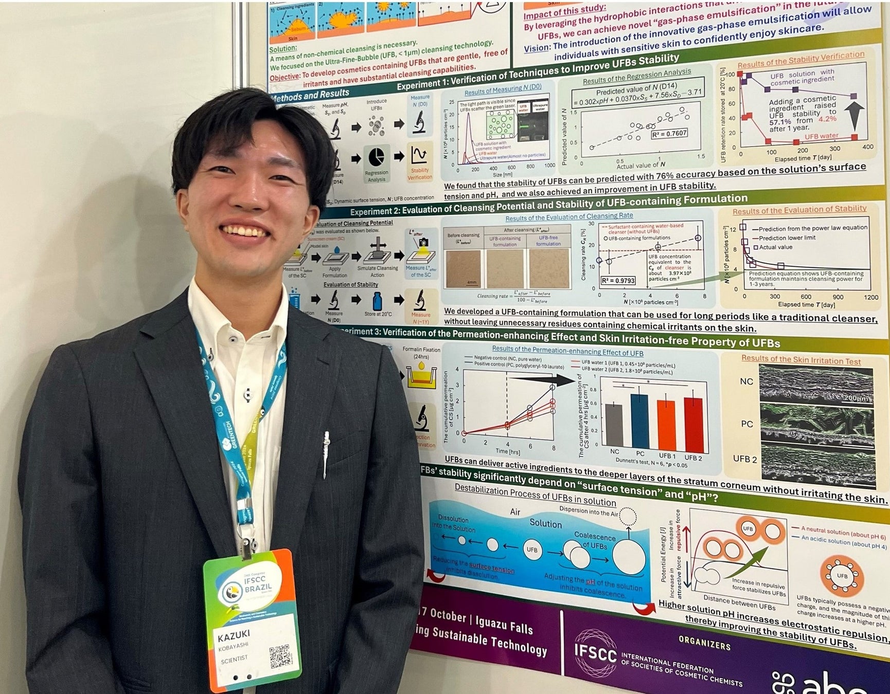 ポーラ・オルビスグループの研究・開発・生産を担うポーラ化成工業株式会社(本社:神奈川県横浜市、社長:片桐崇行)は、2024年10月14日~17日にブラジル・イグアスで開催された第34回国際化粧品技術者会連盟(以下 IFSCC)世界大会にて発表を行い、フロンティアリサーチセンターの小林研究員がポスター発表部門において600件以上の発表の中から「Top10」に選出されました。なお、この他にもポーラ化成工業の発表論文はポスター発表部門にて「最優秀賞」を受賞し、口頭発表アプライド部門にて「Top5」に選出されました。
