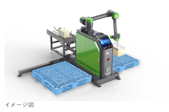 可搬重量max50キロの協働ロボットで作業範囲が大幅アップ、搭載済みの治具とシステムでワンストップパッケージ、手軽なパレッタイジングシステム。
