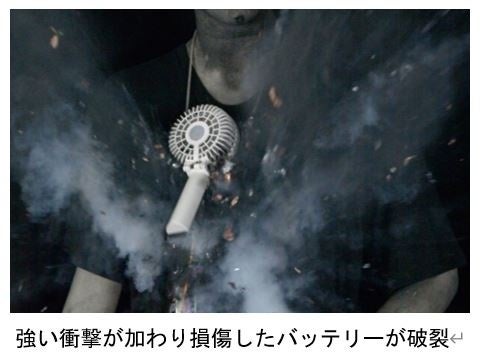 手をすべらせて落下するなど携帯用扇風機に外部から衝撃が加わりリチウムイオンバッテリーがへこむなどすると、内部ショートが生じ発煙や発火するおそれがあります。持ち運ぶときは衝撃が加わらないように注意してください。