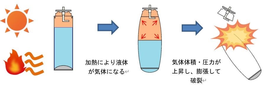 虫よけスプレーや冷却スプレーなど高圧ガスが使われているエアゾール缶には、噴射剤にLPガス(プロパン、ブタン)やDME(ジメチルエーテル)が使用されています。エアゾール缶が高温にさらされると、これらの噴射剤が気化して内部圧力が上昇し、エアゾール缶が破裂することがあります。