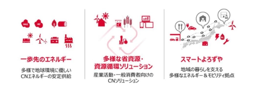 出光興産は2050年カーボンニュートラル社会の実現に向け、2030年ビジョン「責任ある変革者」、2050年ビジョン「変革をカタチに」を掲げています。昨年11月に発表した中期経営計画(対象年度:2023~2025年度)https://www.idemitsu.com/jp/company/managementplan/index.html では、下記の「3つの事業領域」の社会実装を通して「人々の暮らしを支える責任」と「未来の地球環境を守る責任」を果たしていくことを表明しました。