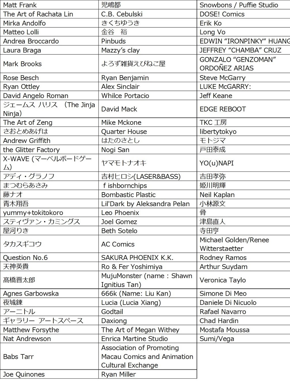 ★アーティストアレイ参加アーティスト名称一覧