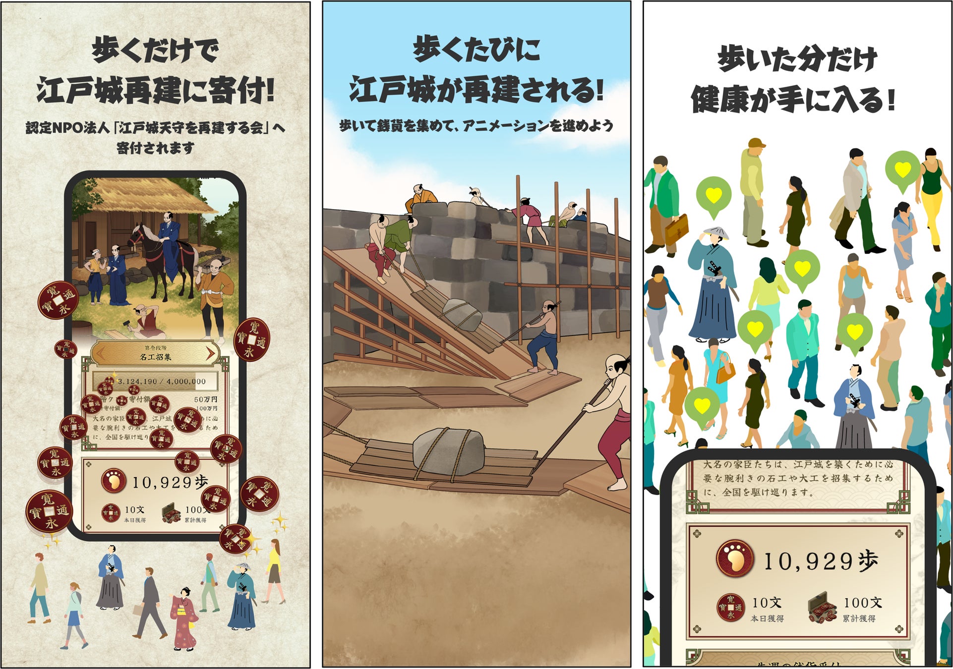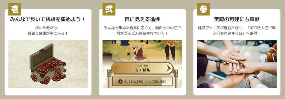 歩くだけで江戸城再建に寄付できるアプリです。本アプリを使用して歩くと1,000歩ごとに銭貨と呼ばれるコインを1枚獲得することができます。全ユーザーの銭貨の総額に応じ、アプリ画面内のアニメーションが変化し、江戸城が再建されていきます。このアニメーションは13段階あり、段階を1つクリアするごとにジオテクノロジーズから認定NPO法人「江戸城天守を再建する会」に10万円が寄付されます。複雑な操作も広告表示もないため、アプリを起動して歩くだけで誰でも簡単に“江戸城再建”に貢献することができます。