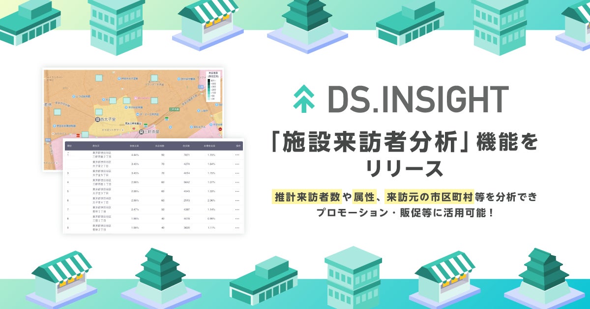 「施設来訪者分析」は、「DS.INSIGHT」の人流データ分析ツール「DS.INSIGHT Place」内の新機能として提供します。ユーザーは、調べたい店舗・施設名を入力するだけで、その店舗の時間・曜日別の推計来訪者数や、性・年代別の傾向、来訪元の市区町村(町丁)、他に訪れる傾向がある店舗などの分析が可能です。これにより、データに基づくチラシ配布地域の見直しや効率化、販促イベントの実施計画、競合店との比較分析による戦略立案などに活用できます。「施設来訪者分析」は「DS.INSIGHT」の料金(※5)のみで利用可能で、本日より事前の導入相談の申し込みを開始します。