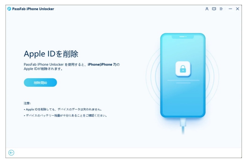 Step1:PassFab iPhone Unlockerをパソコンにダウンロードして起動し、「Apple IDを削除」をクリックします。