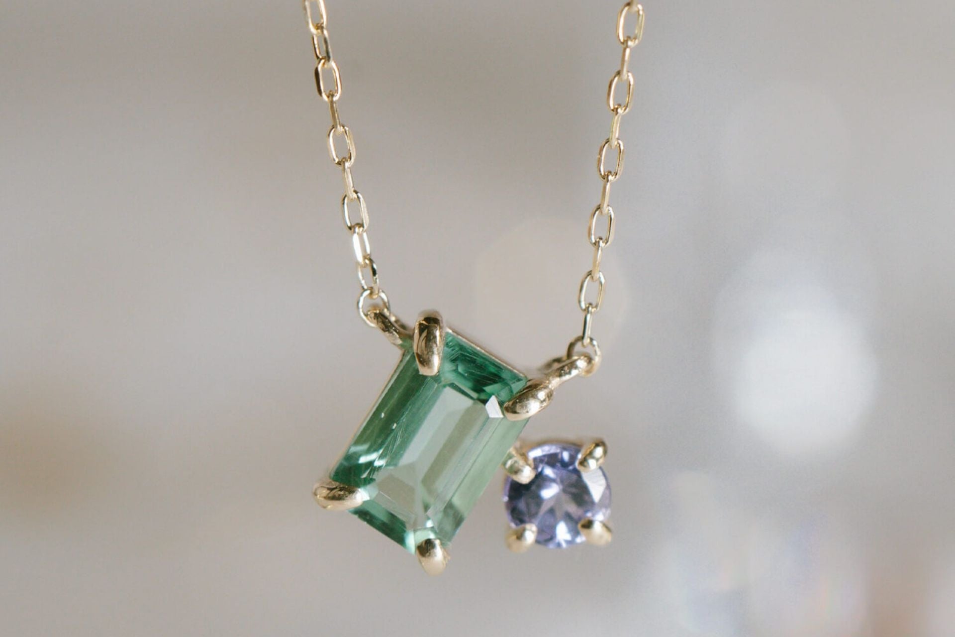 透明感のある爽やかなグリーンクォーツと、鮮やかな蒼色が目を引くタンザナイトの2色のクォーツが繊細な輝きを放ちます。