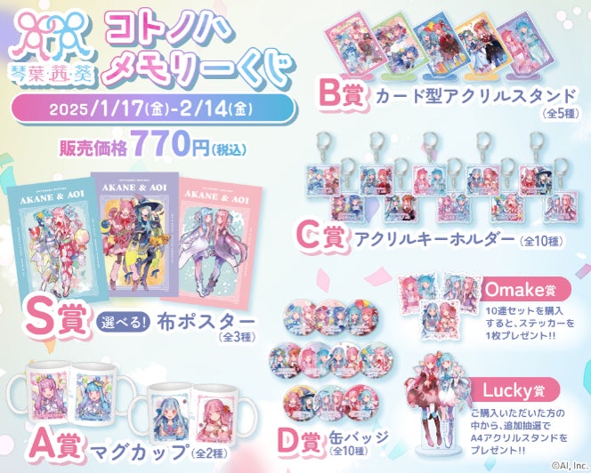 高品質AI音声合成エンジンAITalk®を開発・提供する株式会社エーアイ(本社:東京都文京区、代表取締役社⾧:廣飯 伸一、証券コード:4388、以下:エーアイ)は運営するオンラインくじ「からもるくじ」にて、琴葉 茜・葵の歴代のイラストを新たにグッズ化した「コトノハメモリーくじ」を2025年1月17日(金)より実施します。