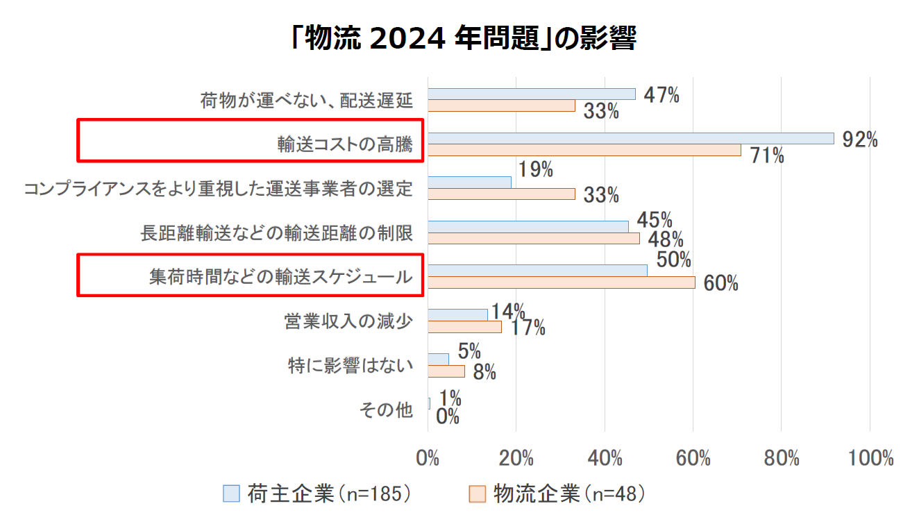 「物流2024年問題」の影響について質問したところ、「輸送コストの高騰」との回答が最も多く、次いで「集荷時間などの輸送スケジュール」が多かった。「特に影響はない」との回答は1割未満にとどまり、「物流2024年問題」が、各企業の物流業務に大きな影響を及ぼしていることがうかがえる。