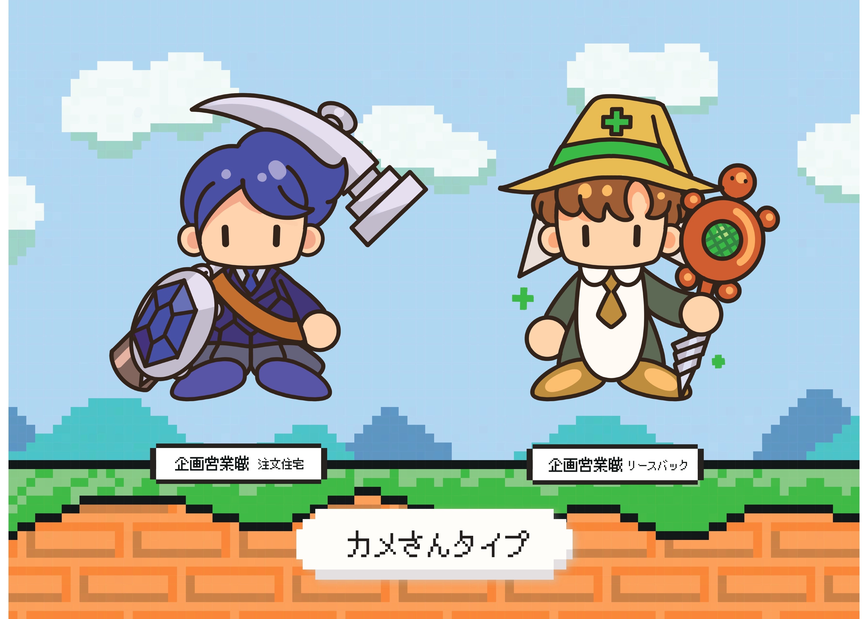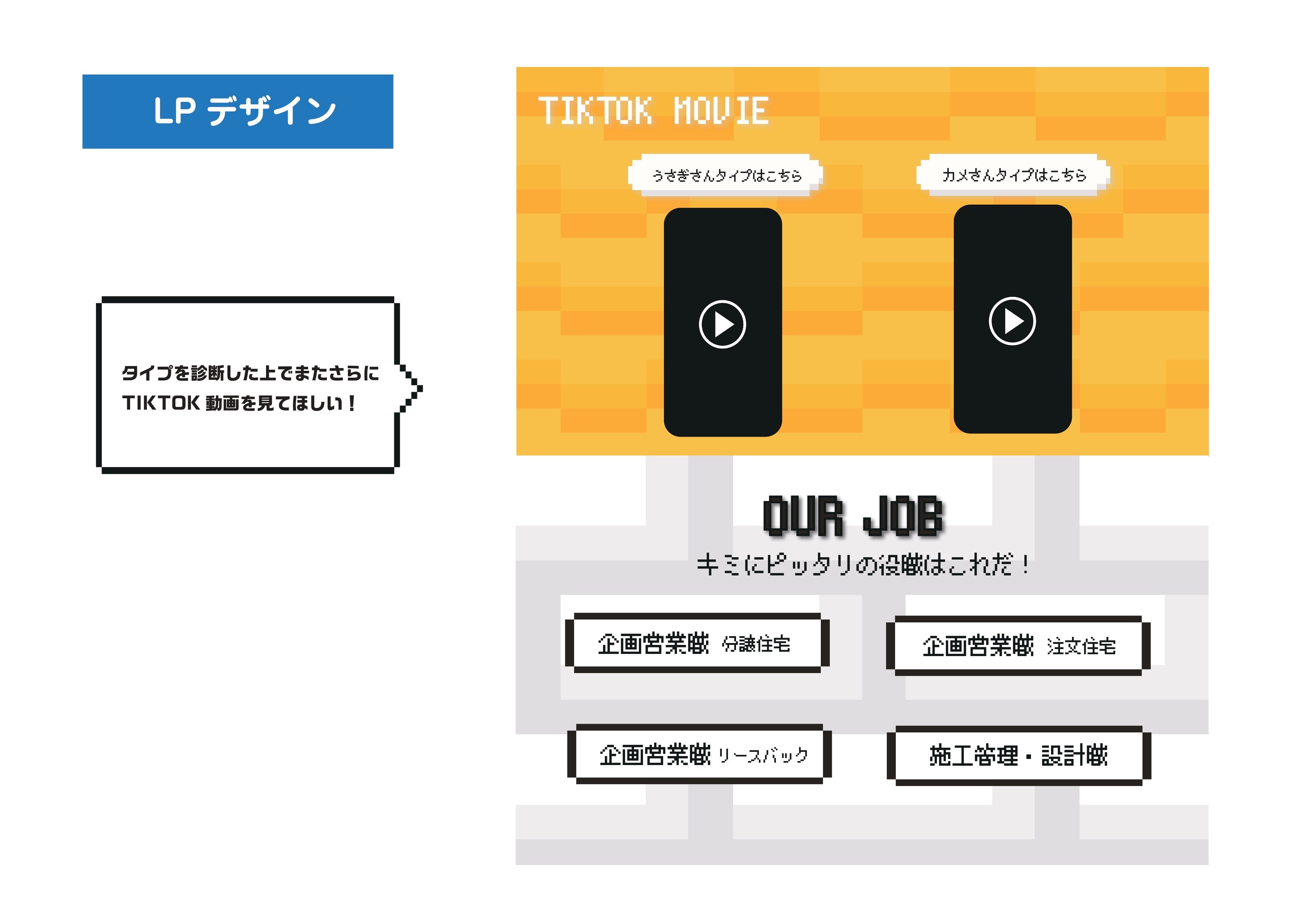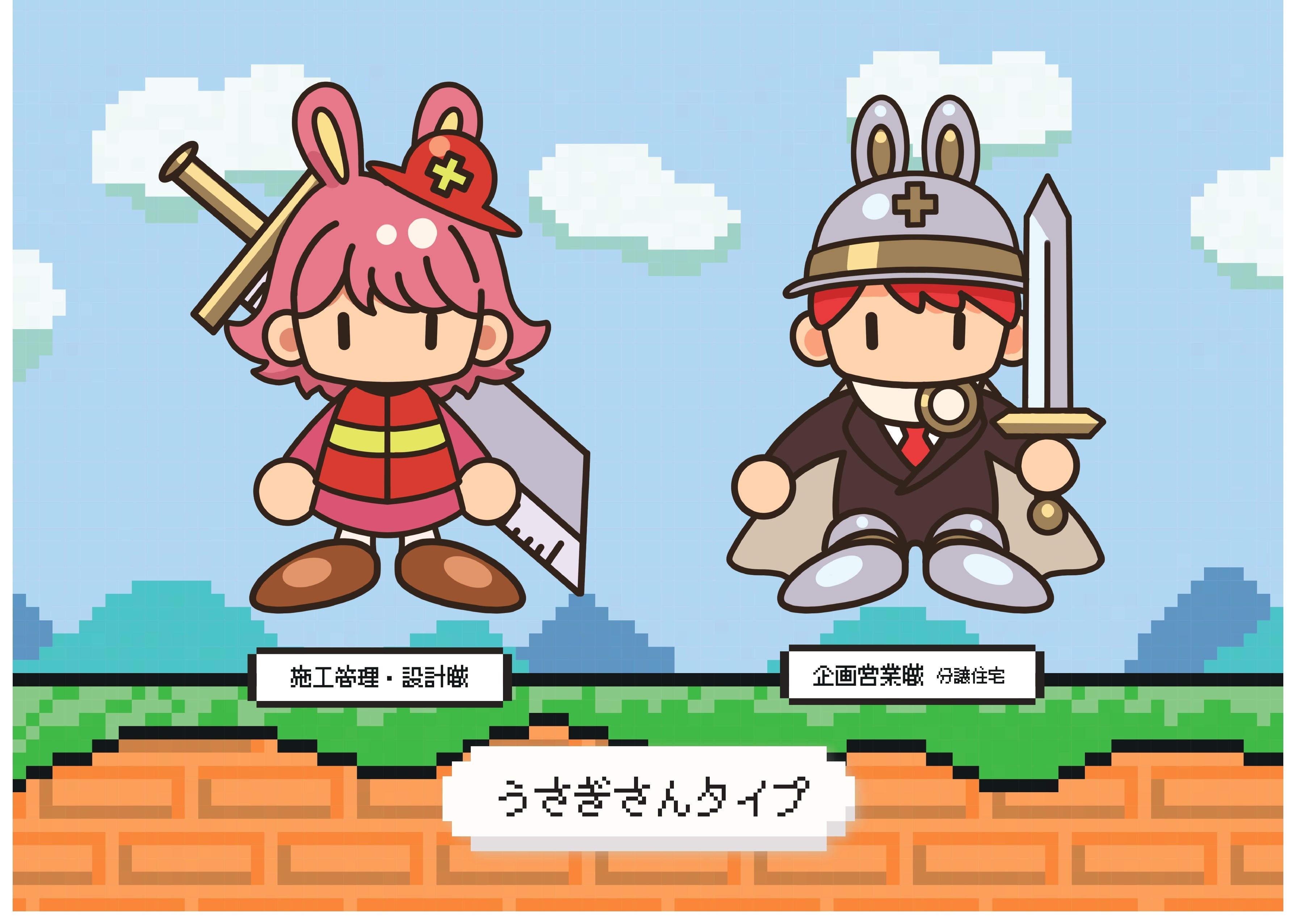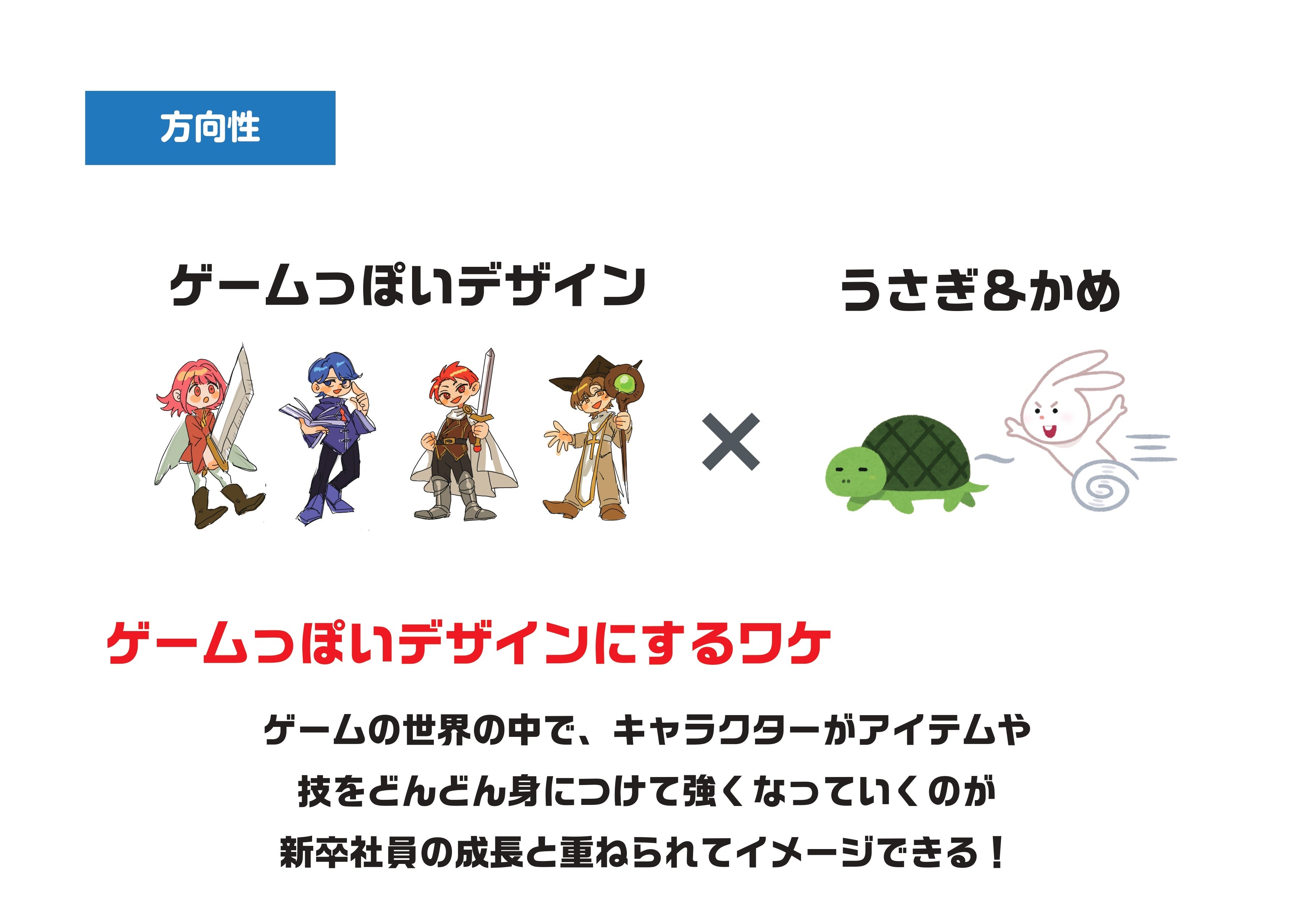 リサーチするなかで、デザインがアニメ風の新卒採用サイトを見て、その企業のイメージとは違う意外性が印象に残りました。そこから、一建設さんが、このような新卒採用サイトを作ると面白いなと思い、ゲーム風のデザインの新卒採用サイトを提案しました。新卒採用サイトのなかで登場するウサギとカメをモチーフにしたキャラクターは、一建設さんの職種をイメージして作りました。また、キャラクターには、ニッカポッカを着せたり、ヘルメットを被せたりしました。
