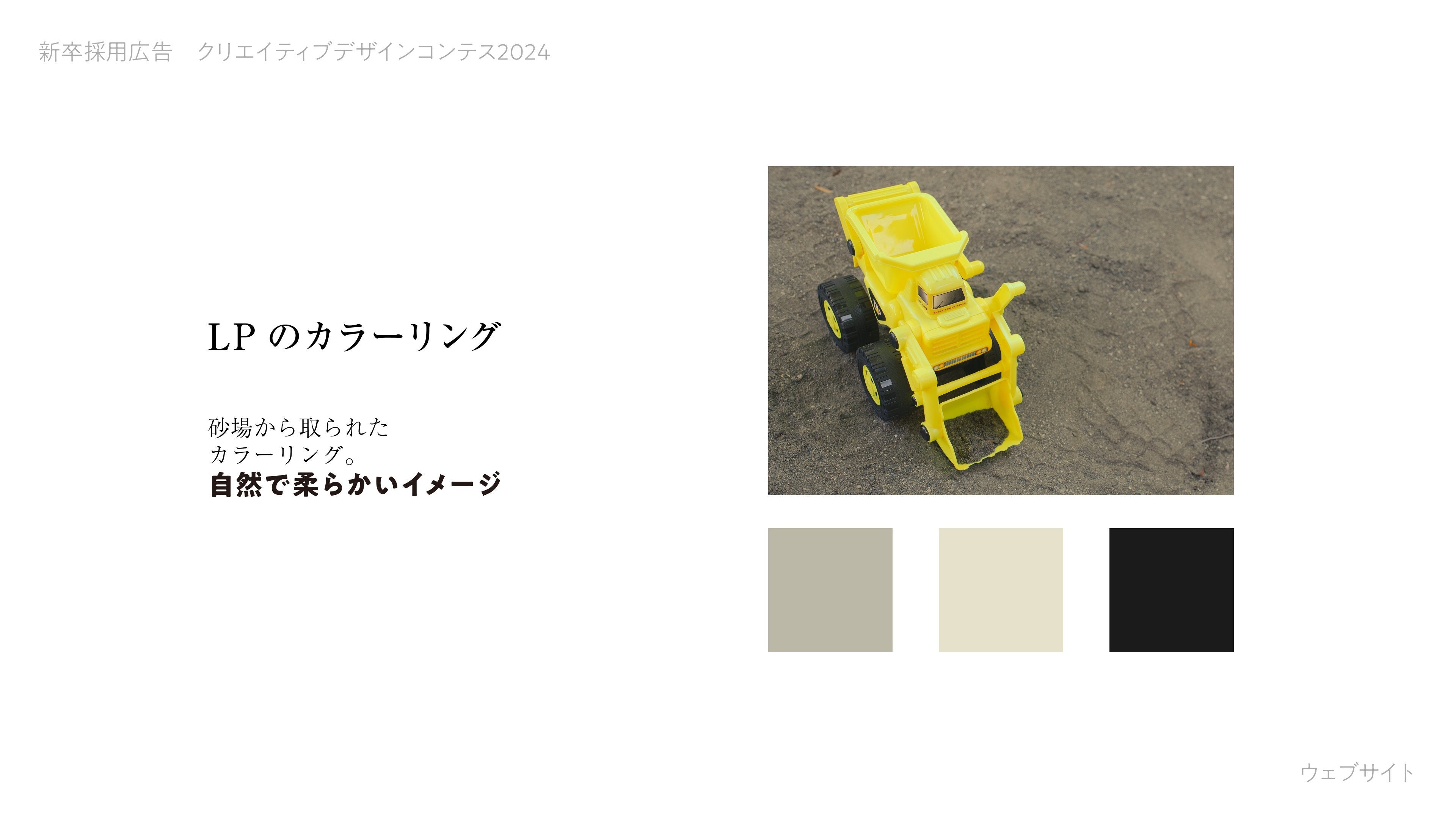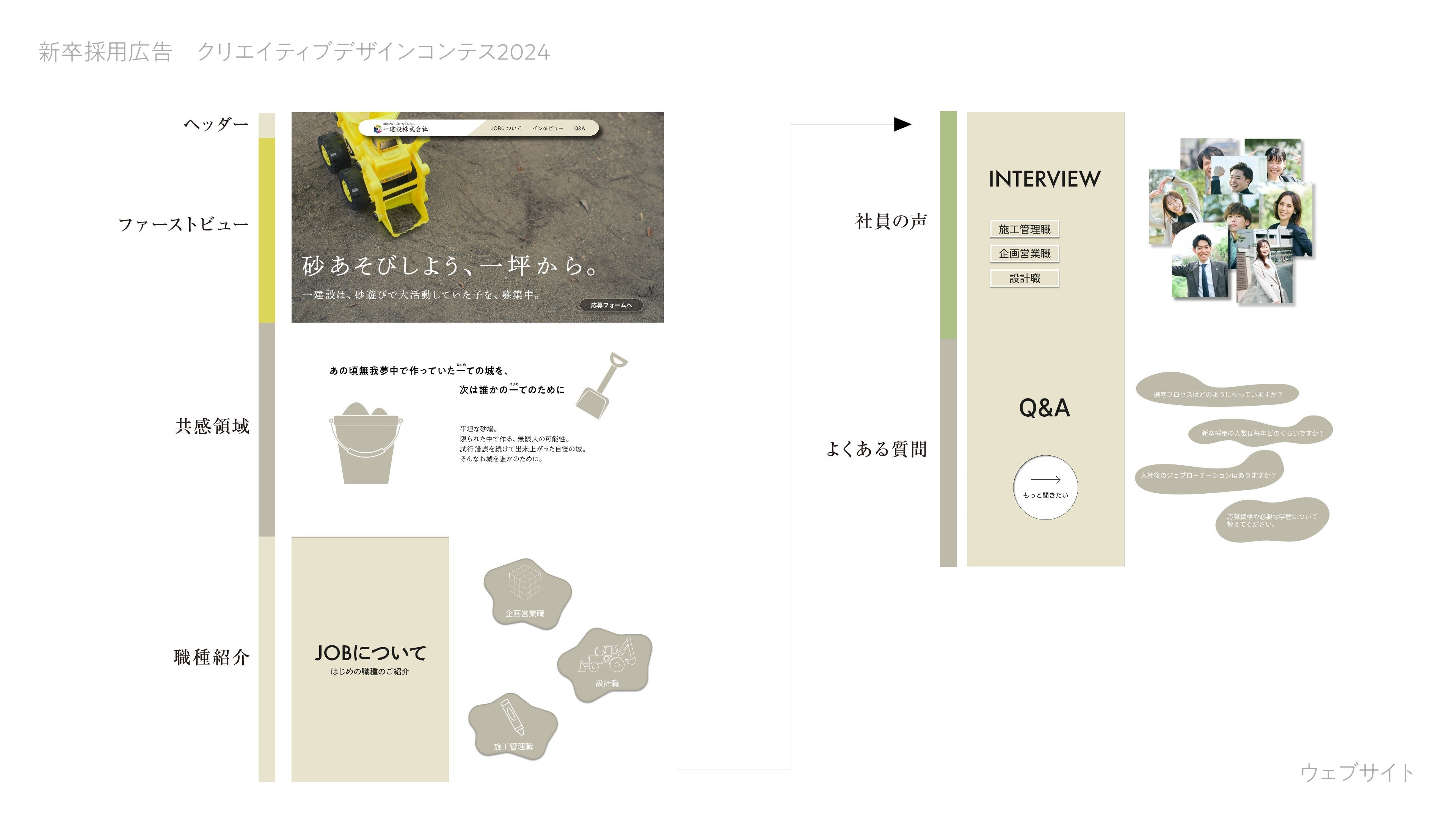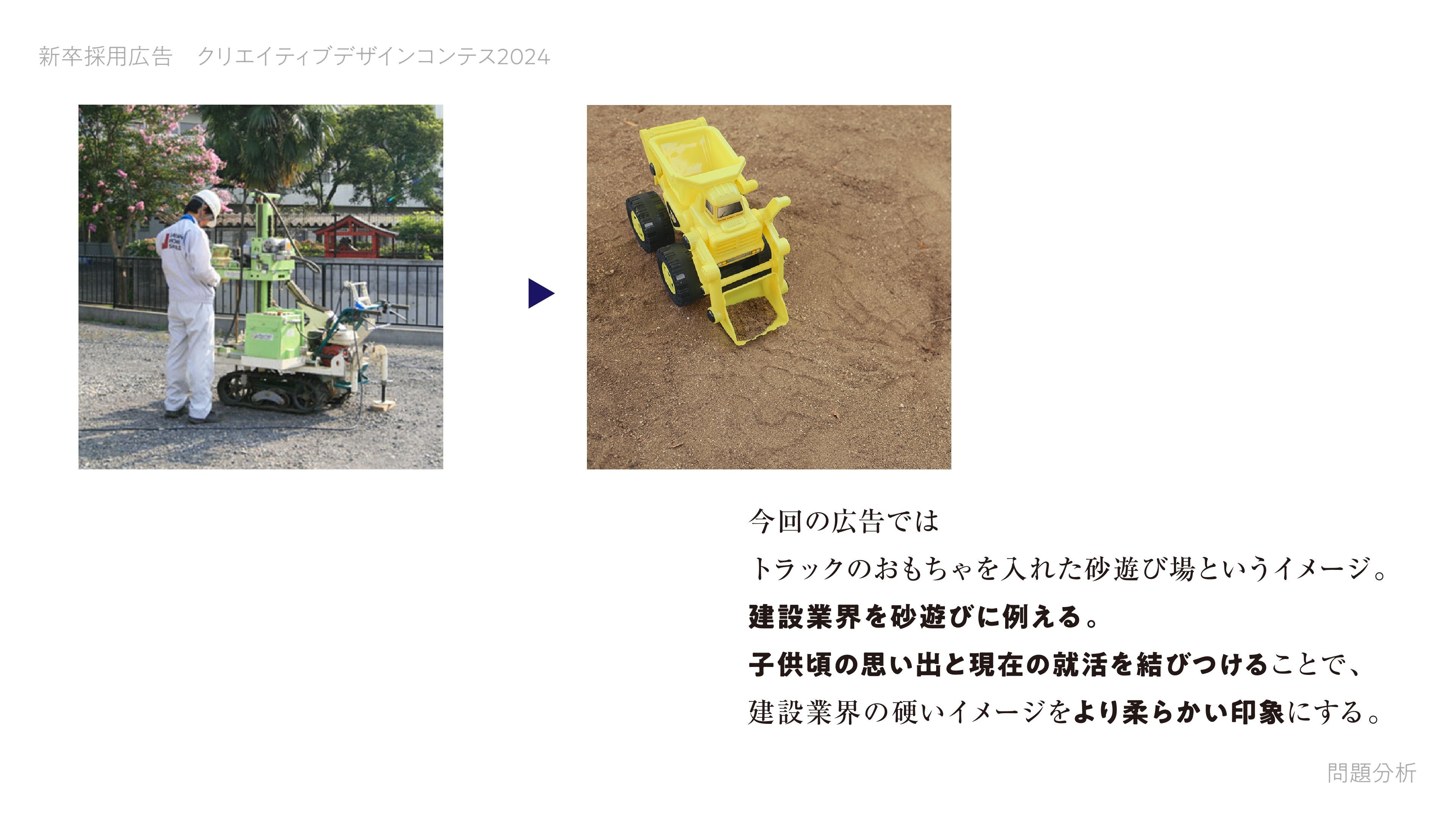 今回の提案では、建設業界を砂遊び場に例えて、建設業界の硬いイメージを柔らかい遊び心のある印象にすることを考えました。業界のことなどをリサーチして、アイデアを出すまでに時間はかかりましたが、皆でアイデアを出して考えた企画が評価されて嬉しかったです。また、これまで知識がなかった建設業界のことを今回のコンテストを通して知ることができたので、今後は建設業界に向けたデザインも発信したいです。