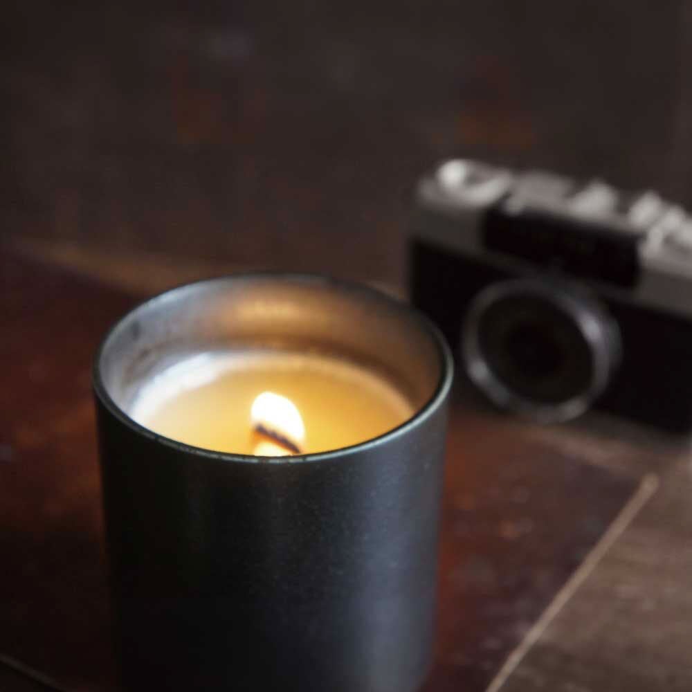 岐阜県下石の窯元でひとつひとつ丁寧に焼き上げられた美濃焼の黒陶に、ソイワックスと木製芯を組み合わせたアロマキャンドル。