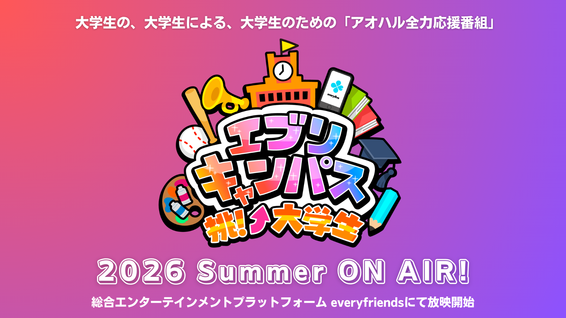 エブリライブ株式会社(本社:東京都港区、代表取締役:影山和義)は、夢と野心を抱えた大学生を応援するWEB番組「挑!大学生 エブリキャンパス」を、自社運営の総合エンターテインメントプラットフォーム「everyfriends(エブリフレンズ)」にて2026年の夏より配信を開始することをお知らせします。